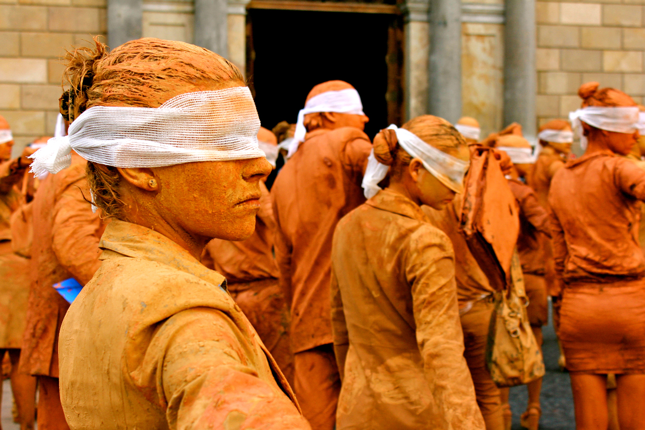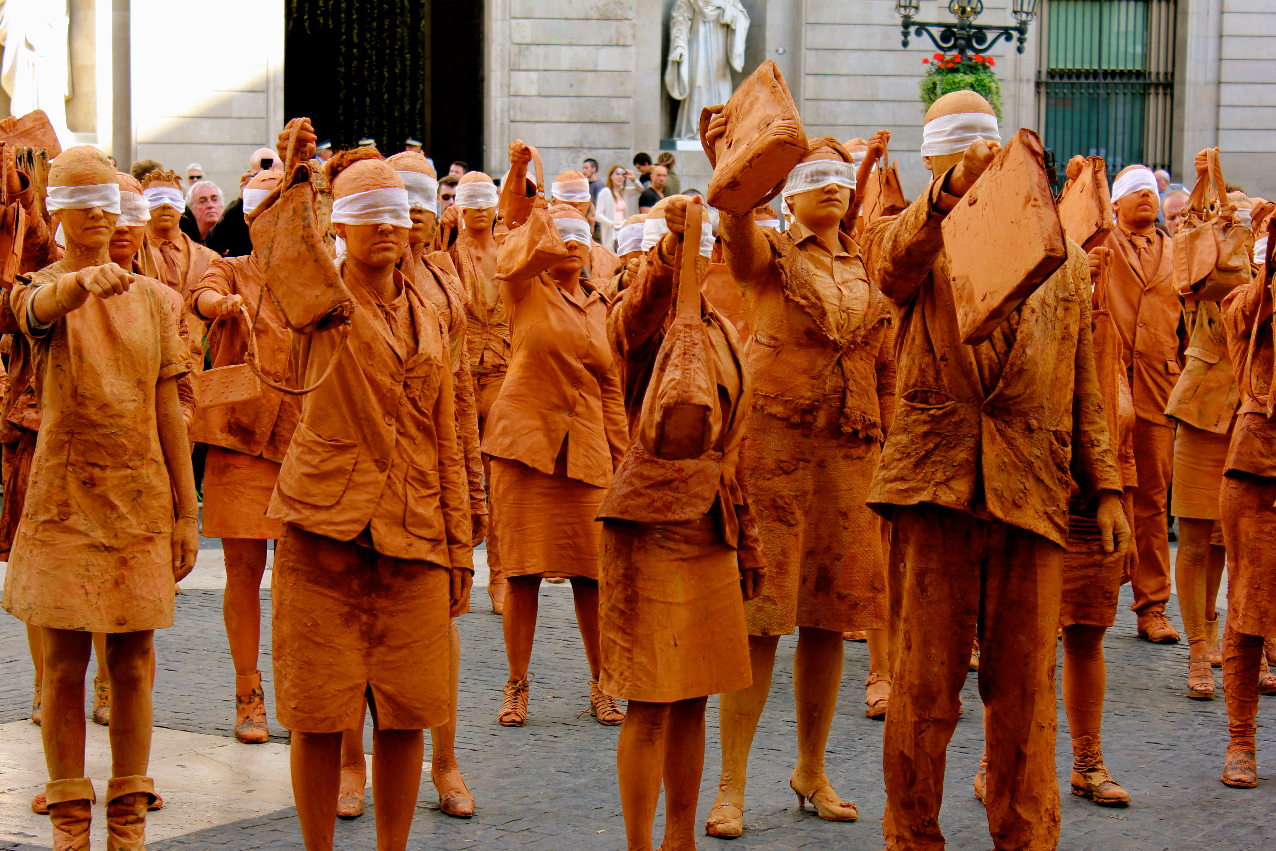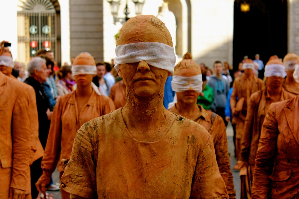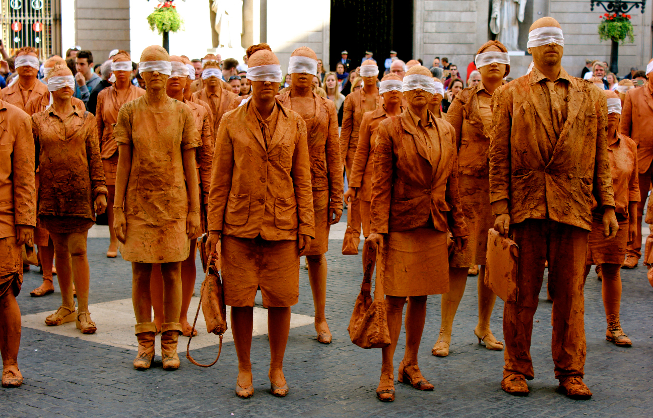 Hombres y mujeres vestidos con traje, cubiertos de barro y con los ojos vendados. Ciegos por seguir la inercia social, se mezclan lentamente con el resto de ciudadanos en los espacios más transitados de la ciudad interrumpiendo su cadencia habitual. Cuando se realiza una crítica social en su propio contexto, se puede confundir fácilmente la obra con la realidad.