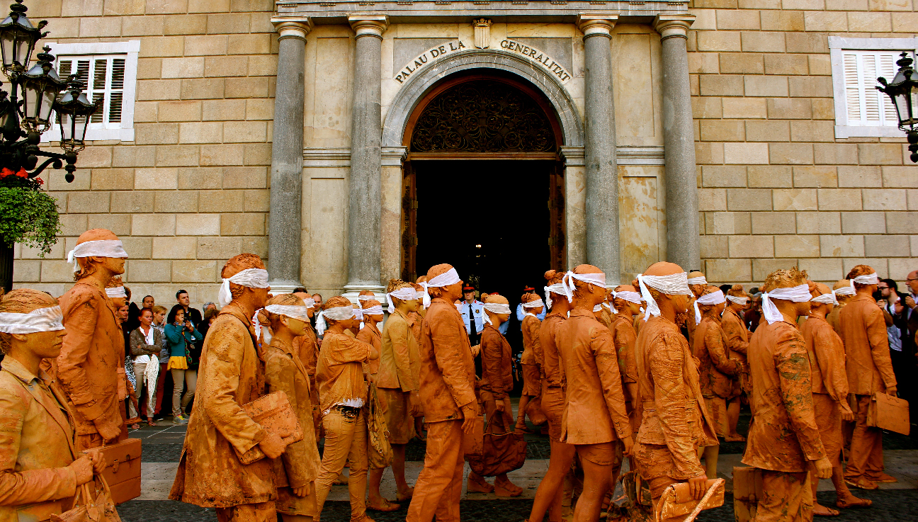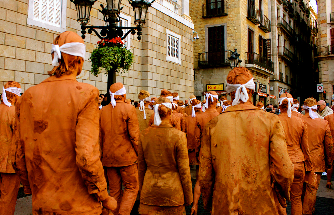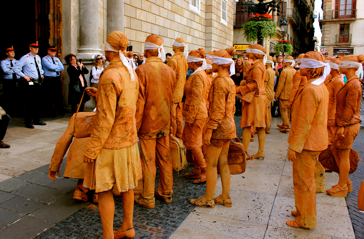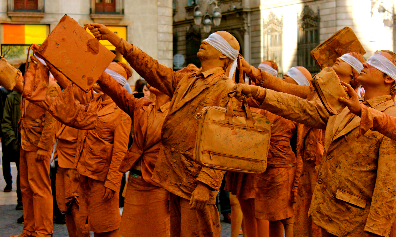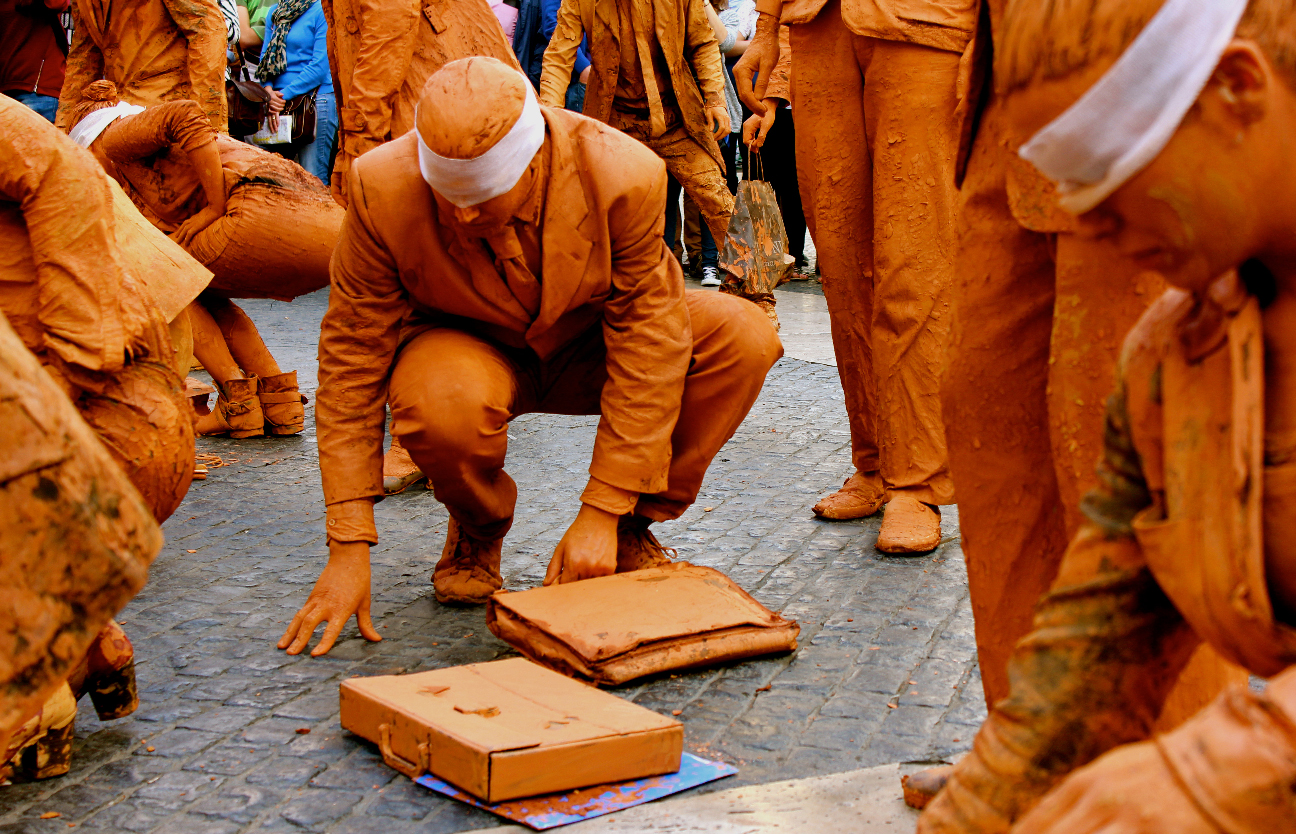 Hombres y mujeres vestidos con traje, cubiertos de barro y con los ojos vendados. Ciegos por seguir la inercia social, se mezclan lentamente con el resto de ciudadanos en los espacios más transitados de la ciudad interrumpiendo su cadencia habitual. Cuando se realiza una crítica social en su propio contexto, se puede confundir fácilmente la obra con la realidad.