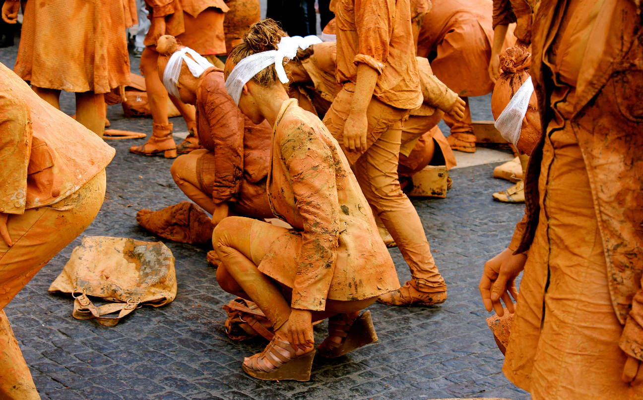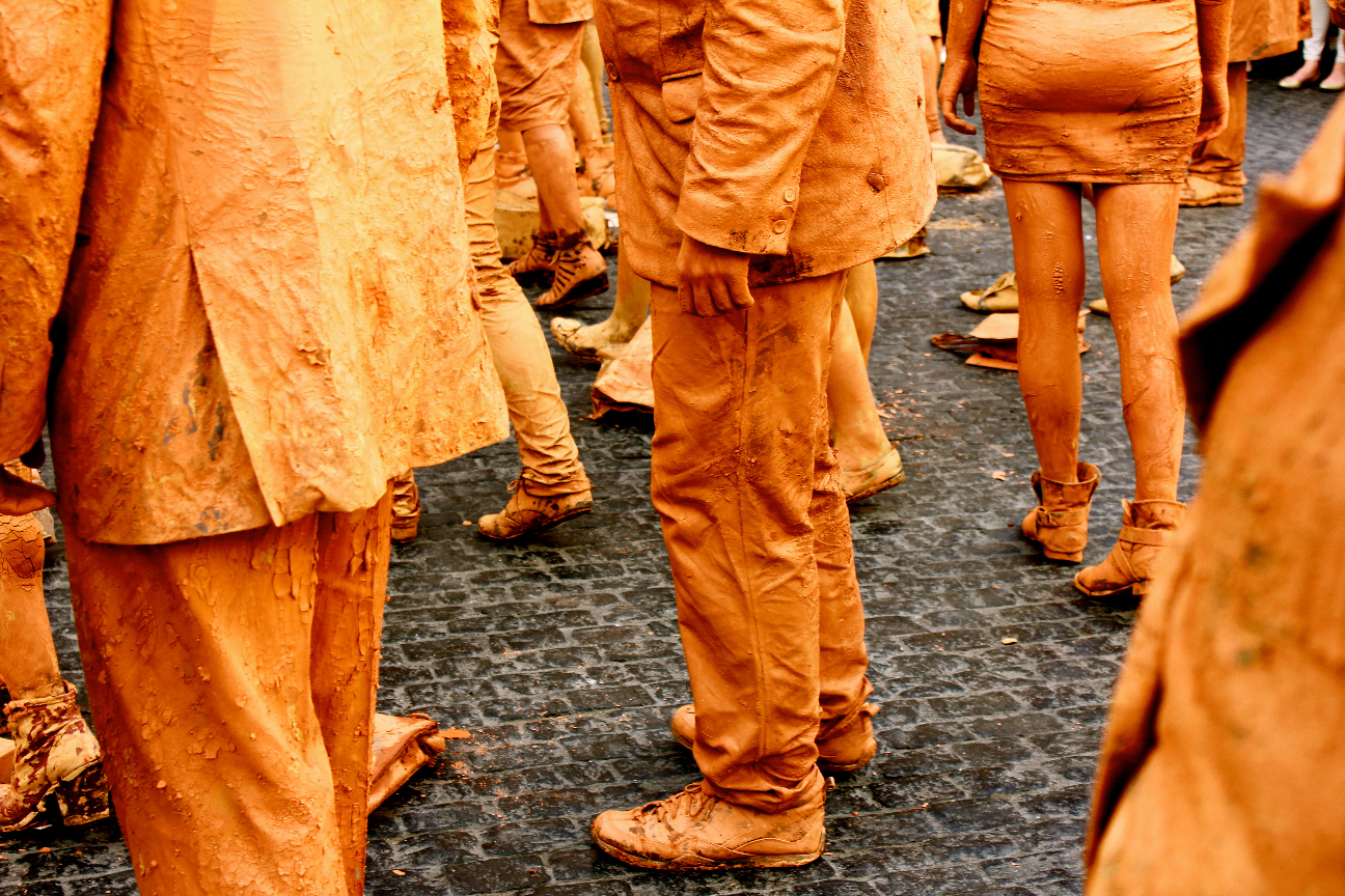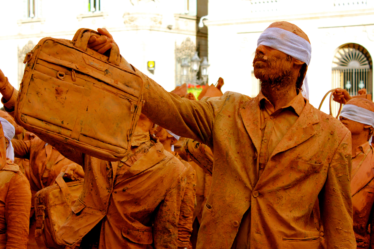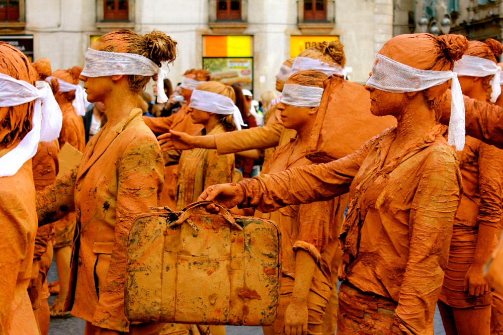 Hombres y mujeres vestidos con traje, cubiertos de barro y con los ojos vendados. Ciegos por seguir la inercia social, se mezclan lentamente con el resto de ciudadanos en los espacios más transitados de la ciudad interrumpiendo su cadencia habitual. Cuando se realiza una crítica social en su propio contexto, se puede confundir fácilmente la obra con la realidad.