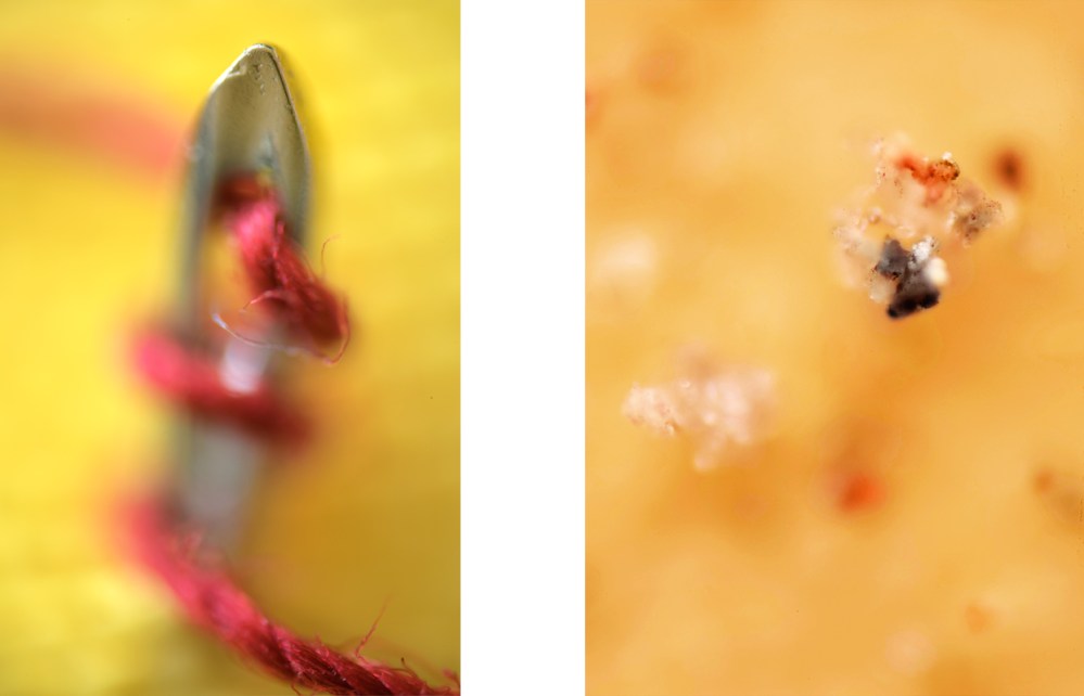 Aguja de coser hecha con un objetivo de microscopio de 10 aumentos y polvo de sombra de ojos hecha con un objetivo de microscopio de 40 aumentos.