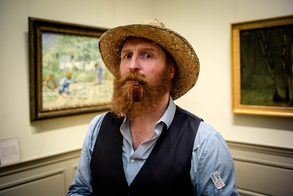 Hombre mayor con ropa militar repartiendo un dossier con su vida