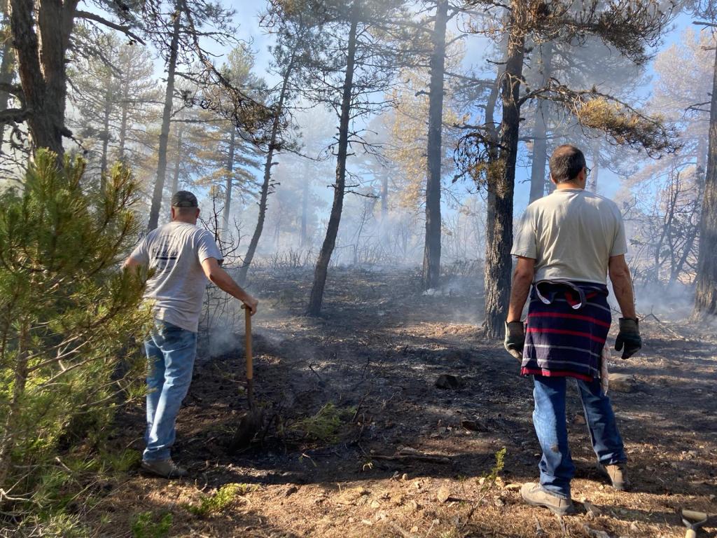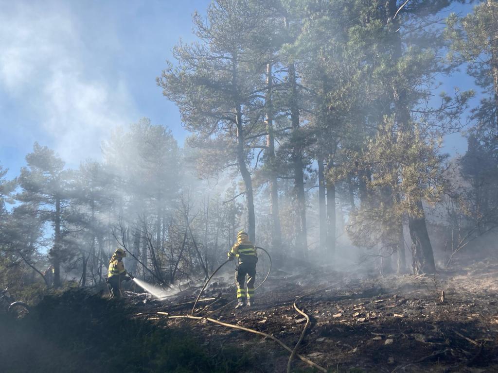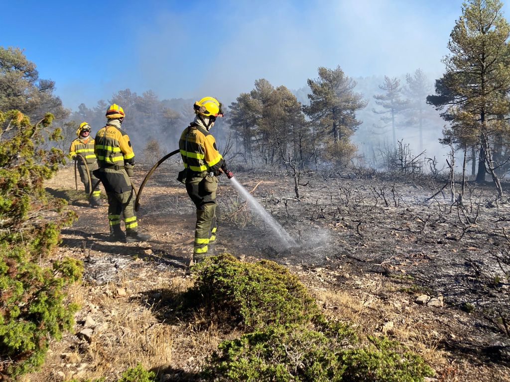 Por suerte, los refuerzos profesionales tampoco tardaron en llegar. Dos cuadrillas helitransportadas de Teruel, un helicóptero de coordinación y dos aviones de carga en tierra de la Comunidad Valenciana que estaban en Bejís ayudaron a perimetrar y sofocar rápidamente los incendios que finalmente solamente han afectado a dos hectáreas. Los esfuerzos se centraron en controlar y limpiar el perímetro. Sin embargo, la tierra no cesaba de emanar humo -a modo de fuegos fatuos- que dejaba constancia de que un incendio también tiene una parte oculta a modo de iceberg.
