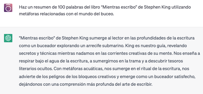 Esto ya me gusta más. Pero ChatGPT no hubiera sido capaz de escribir este copy si yo no le doy bien las directrices. Y para darle estas directrices tengo que saber cuál es mi estrategia y por qué quiero relacionar el resumen con el mundo del buceo. Vamos, que estrategia, claridad y Branding combinados con IA son una maravilla.