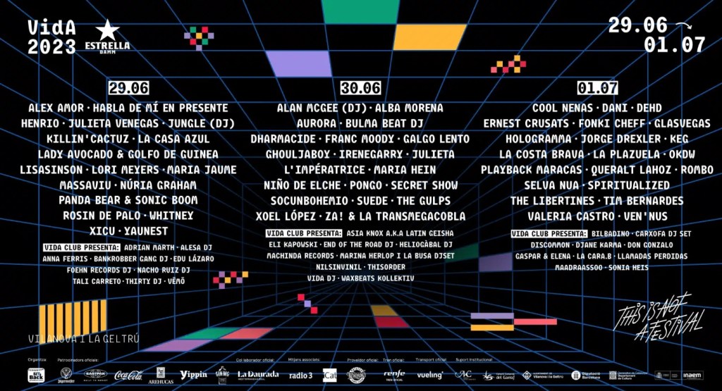 El cartel del Vida también cuenta con un buen puñado más de artistas patrios como Valeria Castro, Dani, La Costa Brava, La Plazuela, Ghouljaboy, Irenegarry, Rosin de Palo y Dharmacide y con muchos artistas de los países catalanes como Queralt Lahoz, Núria Graham, Julieta, Socunbohemio, Henrio, María Jaime, Ernest Crusats, Lisasinson, Ven’nus, María Hein, Hologramma, Habla de mí en presente, Galgo Lento, Rombo, Masaviu, Alba Morena, Selva Nua, Killin’ Cactuz, Yaunest, Xicu, ZA! & La Transmegacobla, OKDW y Playback Maracas.