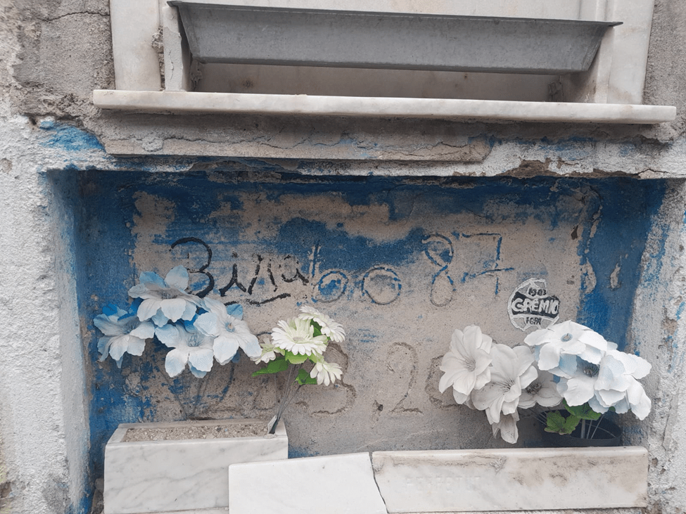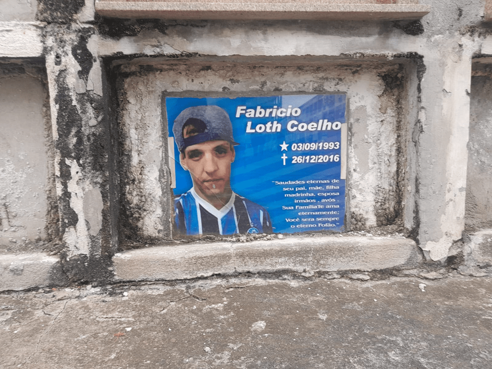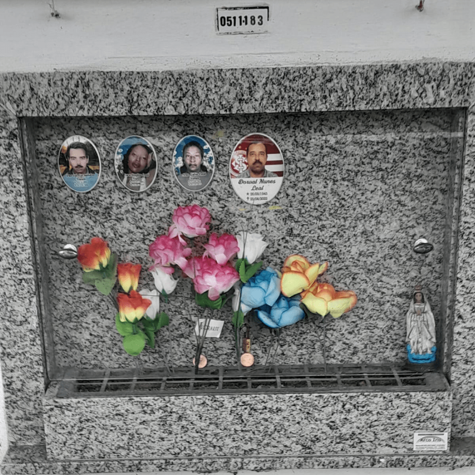 En Brasil las familias adquieren un nicho, en él descansan los restos de varias generaciones. Ante un nuevo fallecimiento, retiran el cajón anterior que debe tener más de cinco años del último deceso, extraen el barro, ropas y restos de huesos, los colocan en una bolsa o urna, esto depende de la decisión económica de los familiares, e ingresa al mismo nicho junto al féretro de otro familiar. En las lápidas suelen estar fotografías de tres o más personas (Figura 4). Cada una de ellas, porta el emblema de su equipo, algunas dinastías preservan su pasión por el mismo equipo o en ese nicho a más de varios restos “conviven” los colores de varios equipos (Figura 5).
