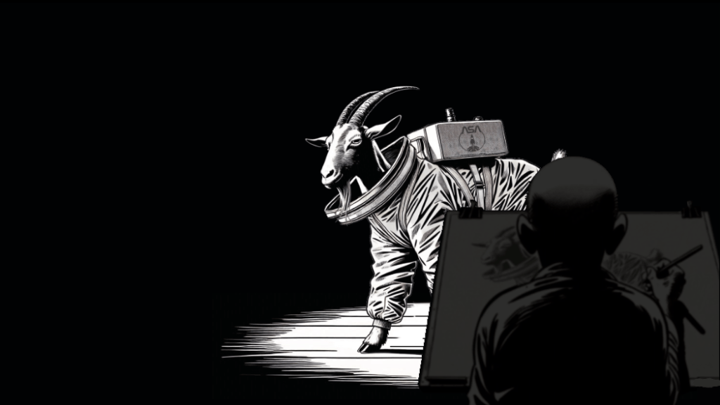 Cuando llego para conversar con los autores de La Cabra, los encuentro en plena faena: Cabra está en la tarima vestida con un traje de astronauta y Ferran, el dibujante, está sentado en la primera fila, esbozando la escena sobre su tablero de dibujo. Intento no hacer ruido, no quiero interrumpir. Además, estoy siendo testigo privilegiado del proceso creativo tras las viñetas de ‘La Cabra’.