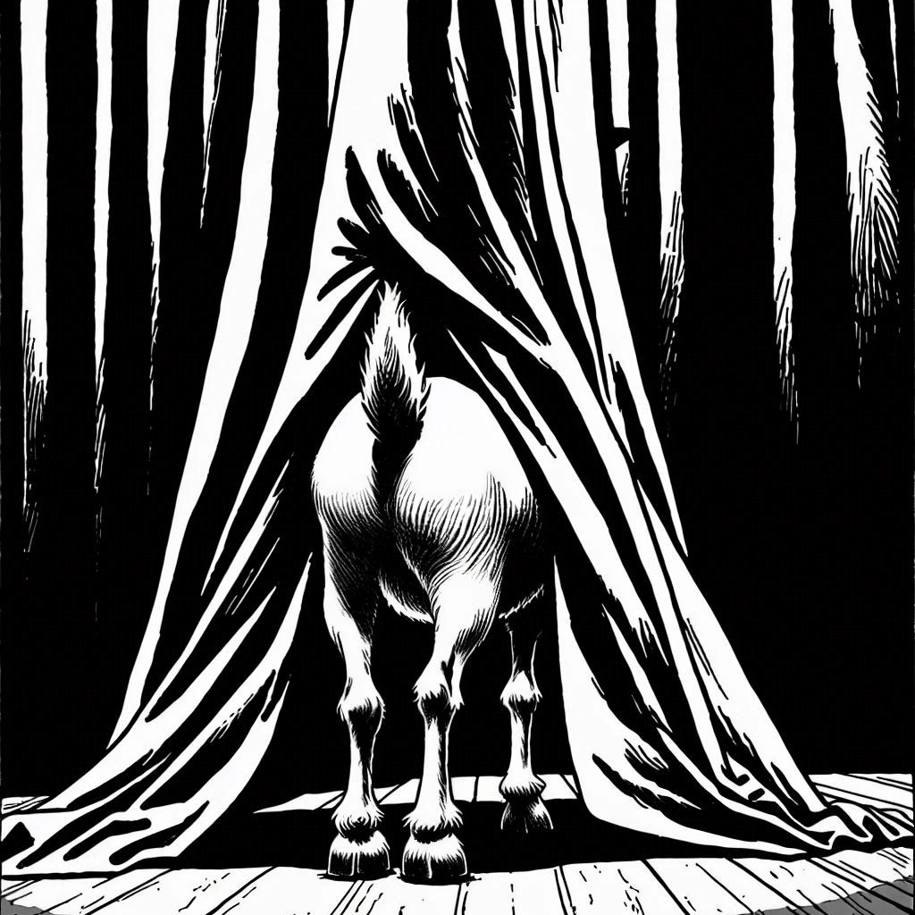 Cabra no dice nada. Se quita el traje de astronauta y, con evidente indignación, mete la cabeza tras el telón en el fondo del escenario, como buscando algo.